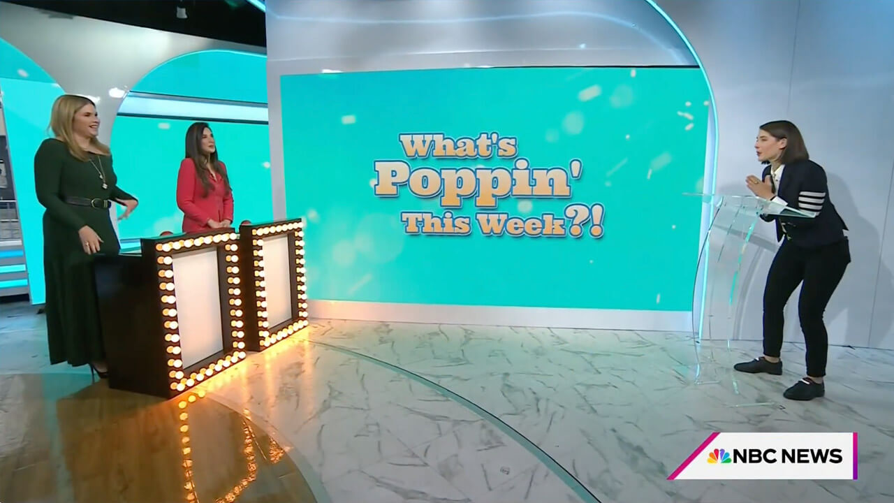 Daryn’s “What’s Poppin’!” segment on the TODAY show with Hoda and Jenna is a recurring monthly stint where she pours over the top five hottest things in pop culture for that month. Topics range from music and books to television and movies to some social media fashion trends and cocktails that Daryn makes Hoda and Jenna try out!